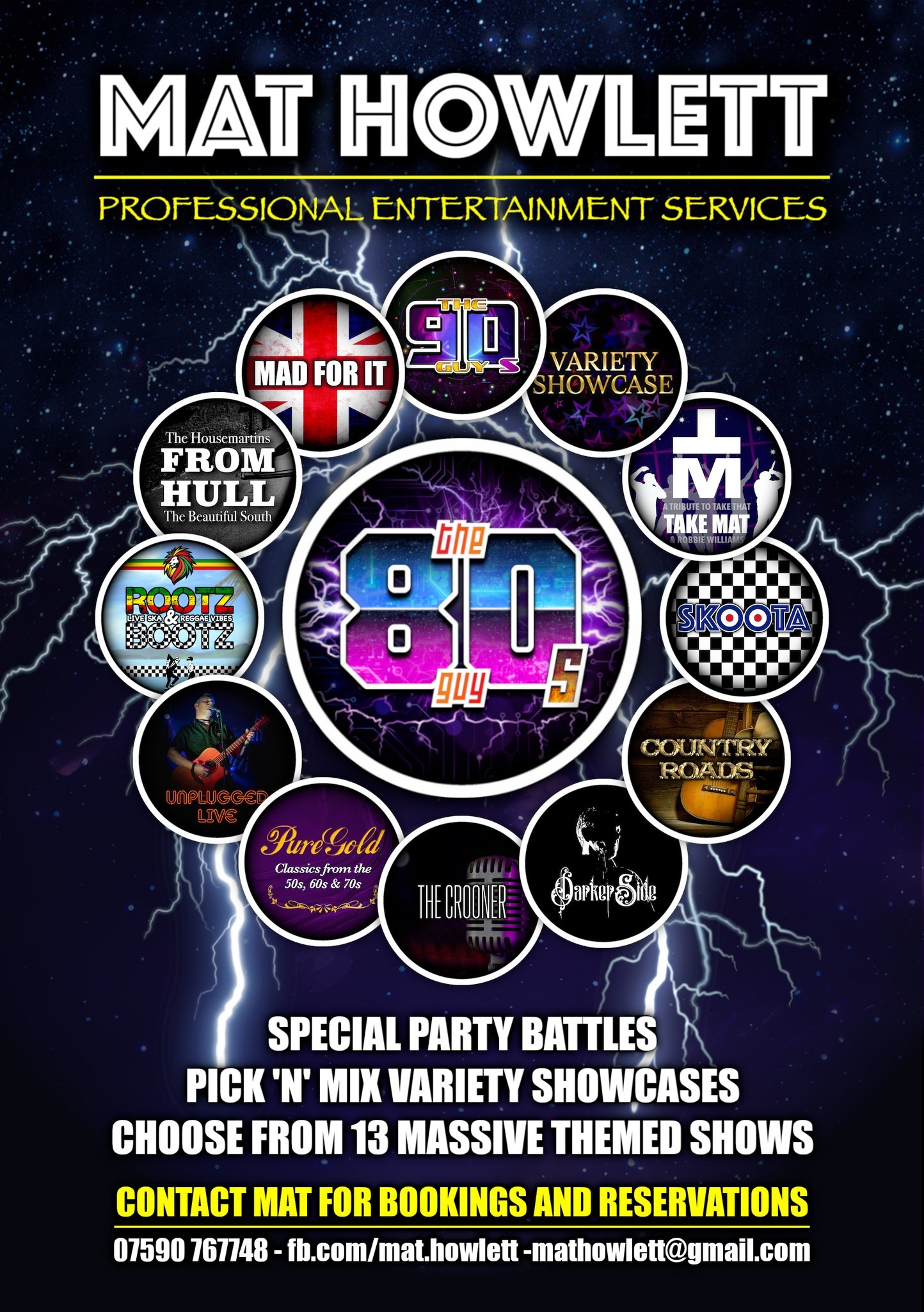 I'm a full time professional entertainer, singer, songwriter, musician and producer. I provide solid, polished performances every time and provide a lively, welcoming and fully inclusive show. I have an ever evoving and growing list of carefully created themed shows to choose from, covering all genres and suitable for all ages. Variety shows are also available with running times of up to six hours.